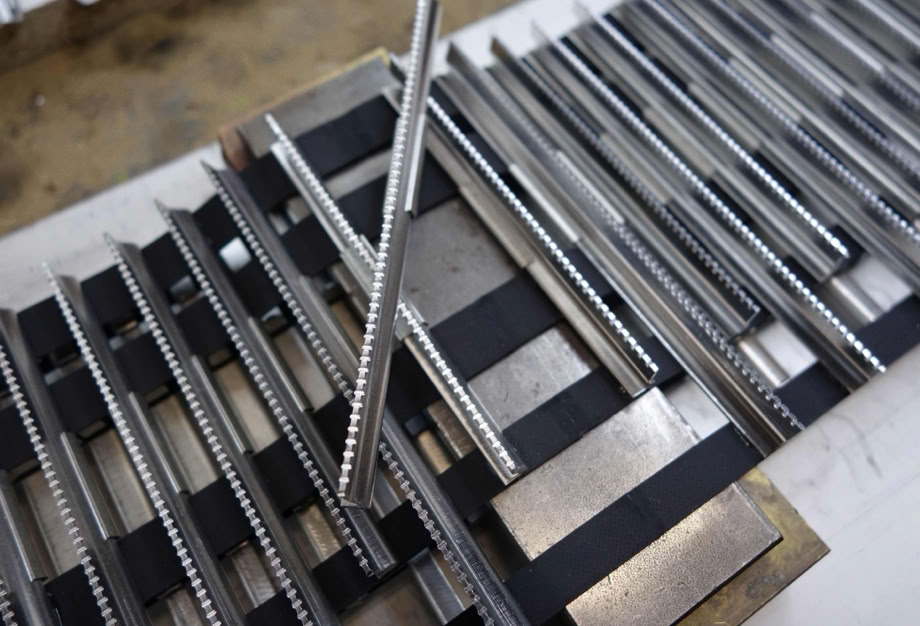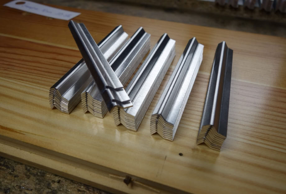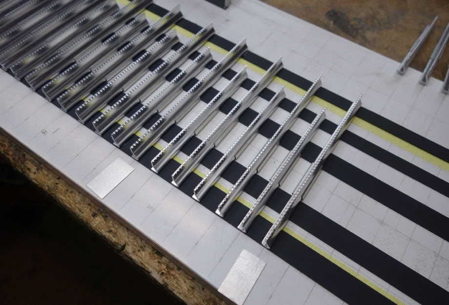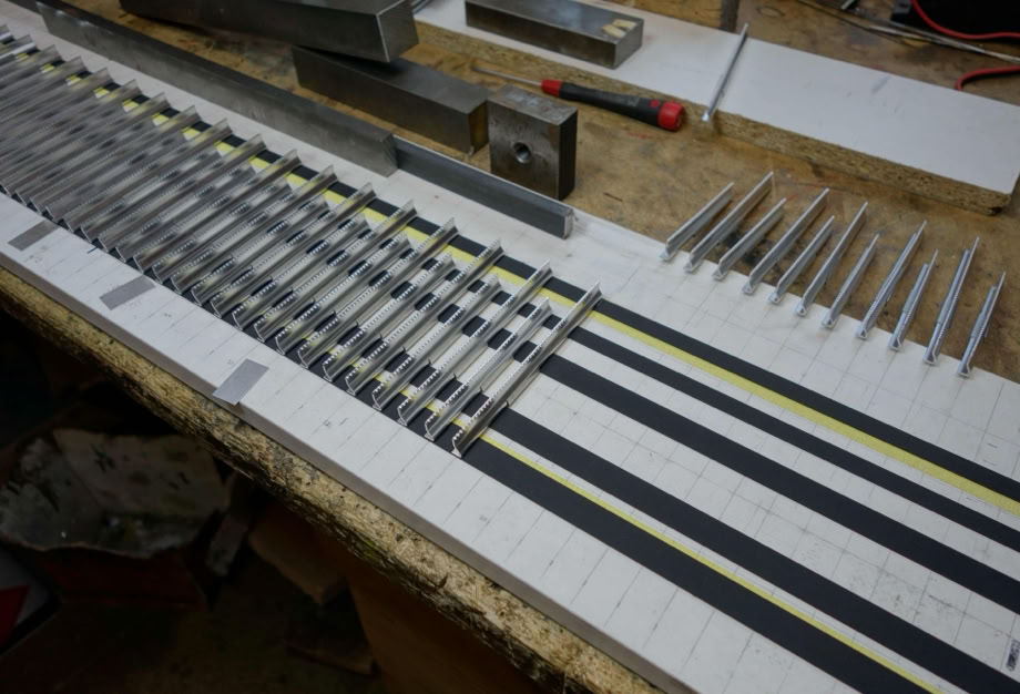 Jeder fertige Spurbügel wird dann nicht einfach auf einen Haufen geworfen, sondern gleich auf einem langen Brettchen abgelegt.