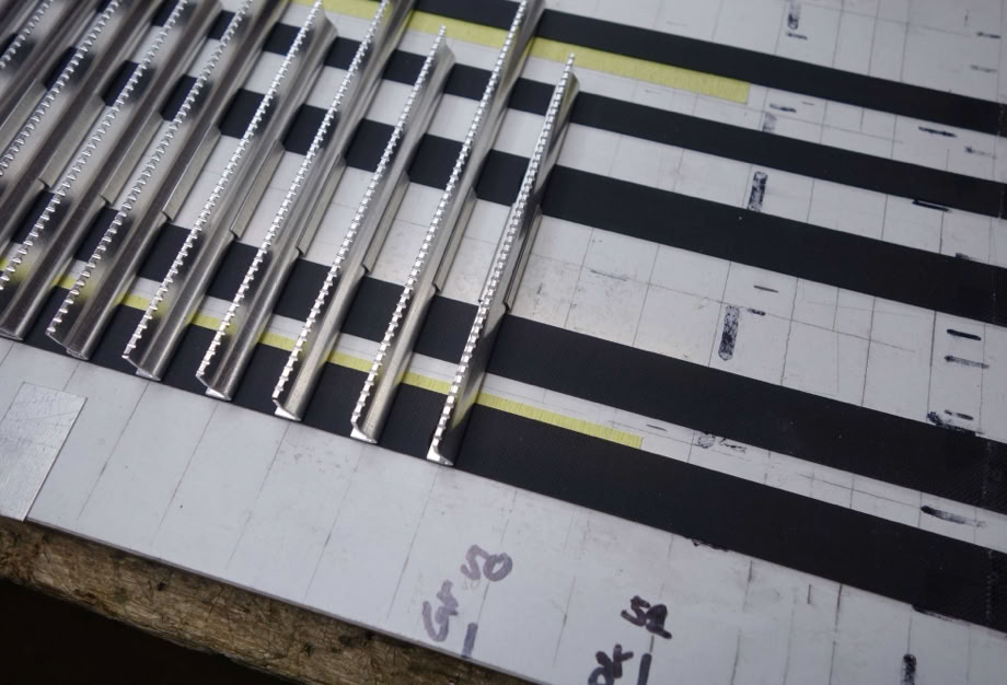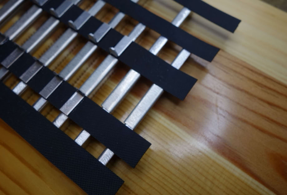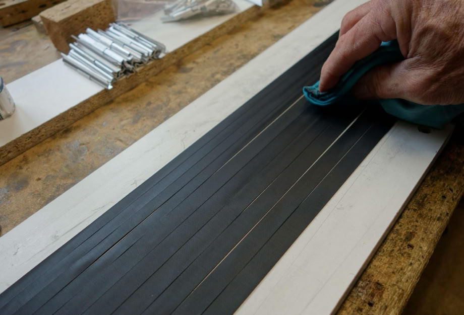 Da die profilierten Stege oft minimal schüsseln, päppe ich unter die zwei äußersten Bänder eine Lage Kreppband.