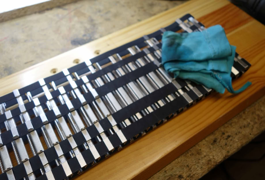 Die Bänder haben jetzt die richtige Länge, sie liegt auf den Stegen und wird jetzt mit Nitro sauber abgewischt. Anschließend gut ablüften lassen!
