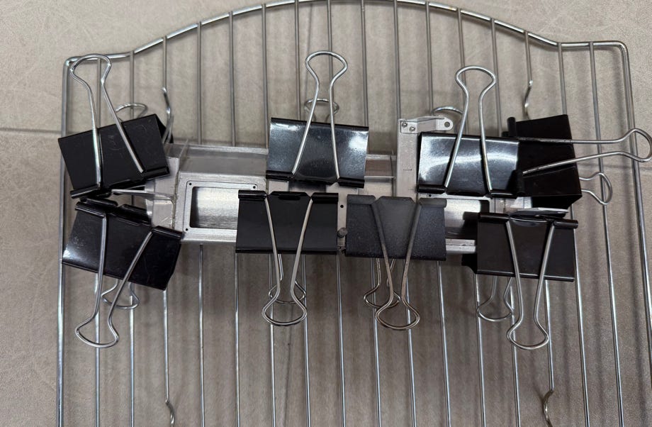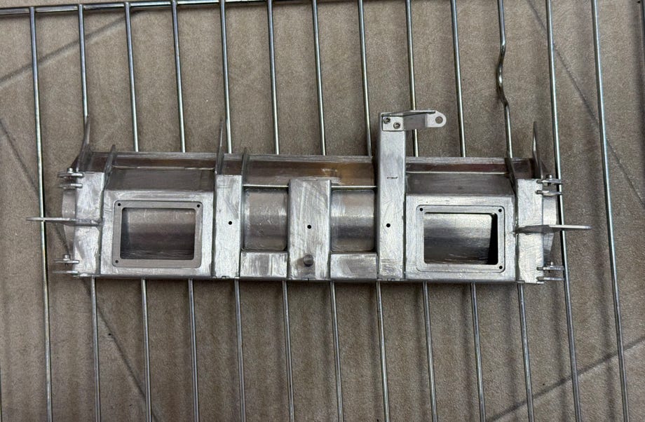 Das Fahrgestell ist eine solide Konstruktion aus Blechteilen, die ich mit UHU plus endfest 300 im Backofen verklebt habe. Interessant ist der fixe Ausleger hinten für den Heckgeräteträger.