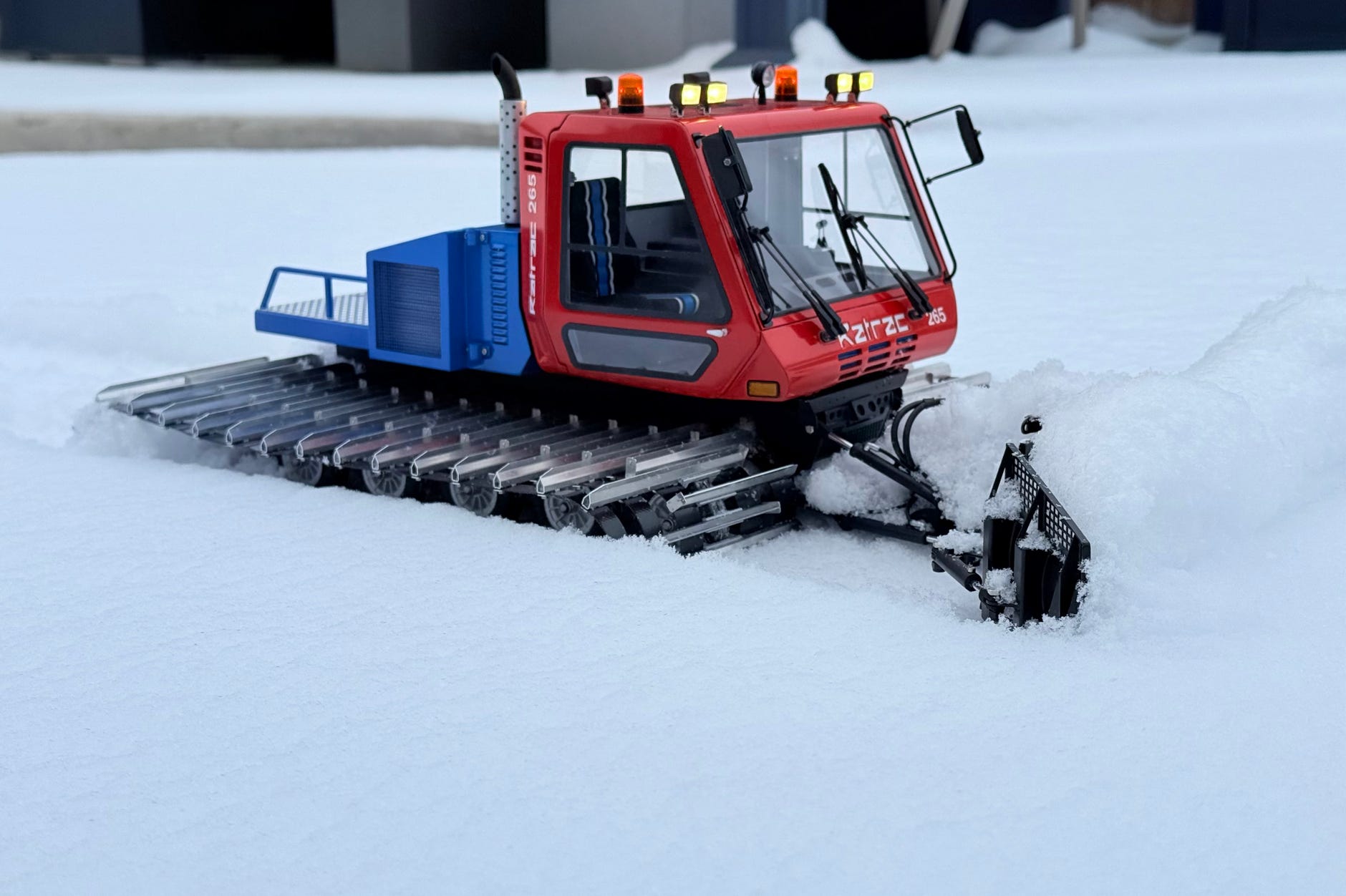 Die Ratrac 265 wurde 1992 erstmals in USA vorgestellt, und zwar als LMC 3700 CF, in Europa wurde sie als Ratrac 265 verkauft. Diese Raupe war ihrer Zeit technisch voraus, allerdings wurde sie auch von einigen Problemen geplagt. Sie war eine der letzten Ratrac Pistenraupen, es folgte nur noch die 400 mit zwar gleicher Kabine, aber anderer Technik. Das Vorbild für unser Modell ist Baujahr 1996 und war noch 2018 an der Ganzsteinschanze in Mürzzuschlag in Österreich im Einsatz, wo es von den Schweizer Modellbauern fotografiert und abgemessen wurde.