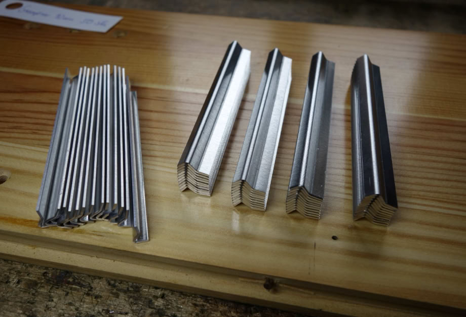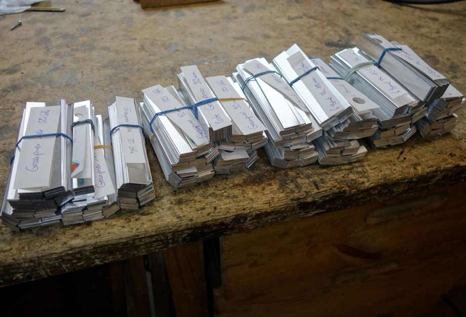 Jeder fertige Spurbügel wird dann nicht einfach auf einen Haufen geworfen, sondern gleich auf einem langen Brettchen abgelegt.